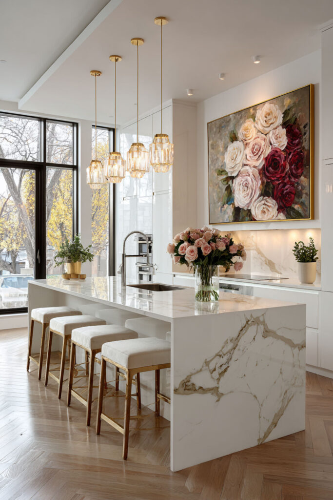 Your island offers the perfect stage for floral displays—fresh arrangements, potted herbs, or a permanent floral centerpiece. This central location means maximum impact from minimal flowers. Keep arrangements low for conversation across the island.