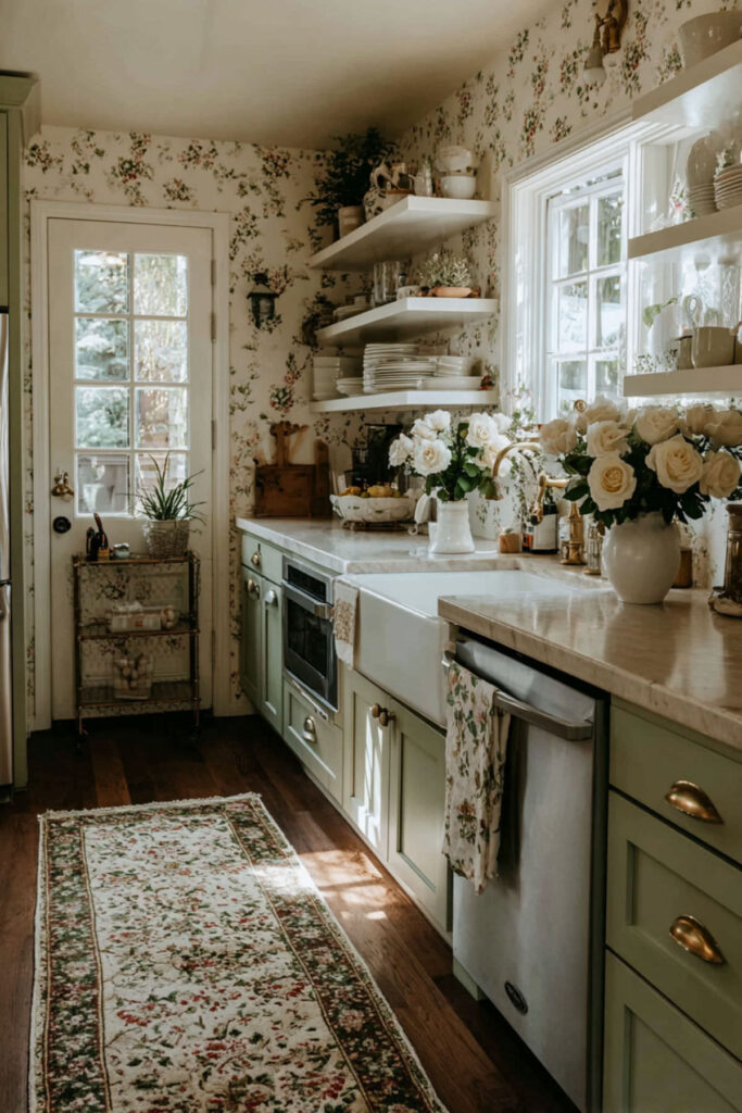 Small kitchens actually benefit from florals—the patterns add personality that prevents compact spaces from feeling bland. Use floral wallpaper on one accent wall, add a floral roller shade, or display a collection of floral plates. The key is choosing one focal floral element.