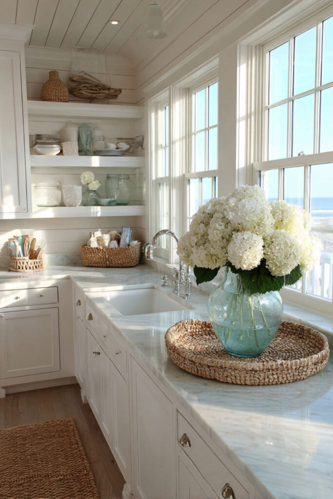 Coastal kitchens with florals—think tropical flowers, beach roses, or botanical prints with ocean themes—bring vacation vibes home. Pair florals with blues, whites, and natural textures for an authentic coastal feeling. This combination feels fresh and escapist.