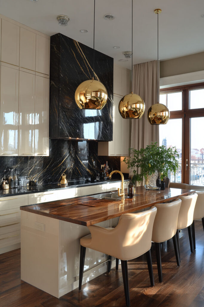 Add sophistication through metallic lines that reference French tip’s delicate edge. Brass inlay in black counters, gold edge-banding on white cabinets, or chrome strips where surfaces meet. These metals add warmth to the stark contrast while maintaining linear precision.