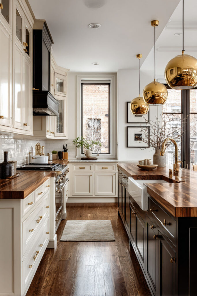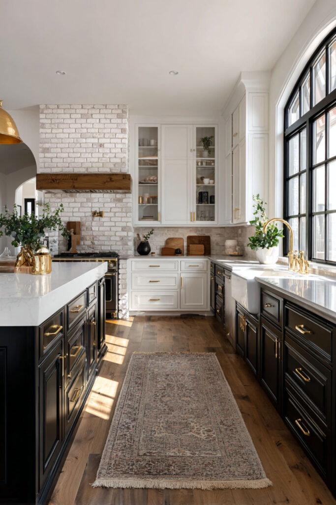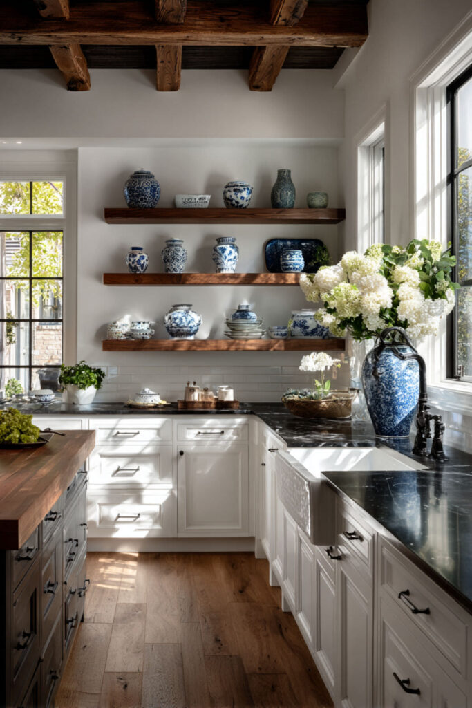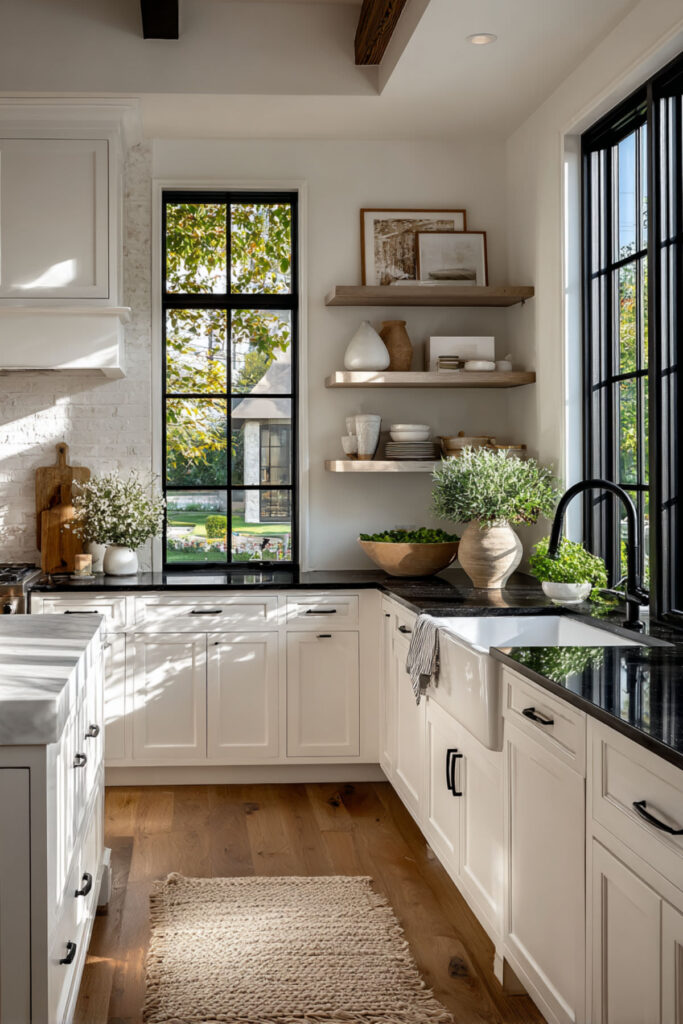 High contrast can feel cold, so add warmth strategically. Wood cutting boards leaning against the backsplash, cream rather than pure white for softer contrast, or warm-toned lighting.