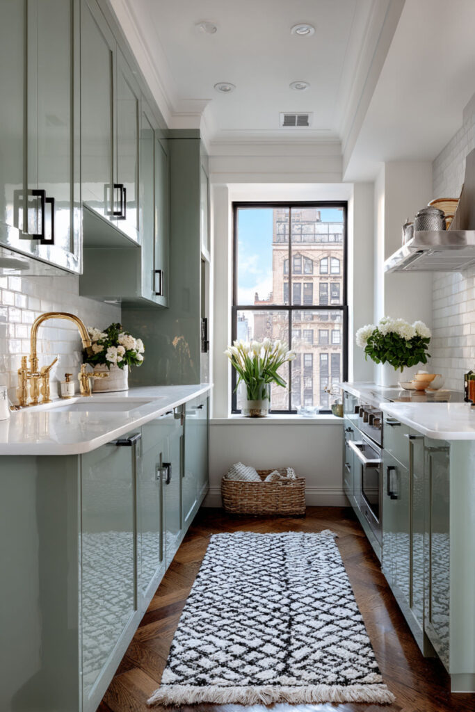 Small kitchens benefit from French tip principles because contrast creates definition without clutter. A single black accent wall against white cabinets, black floor with white everything else, or white kitchen with black window frames.