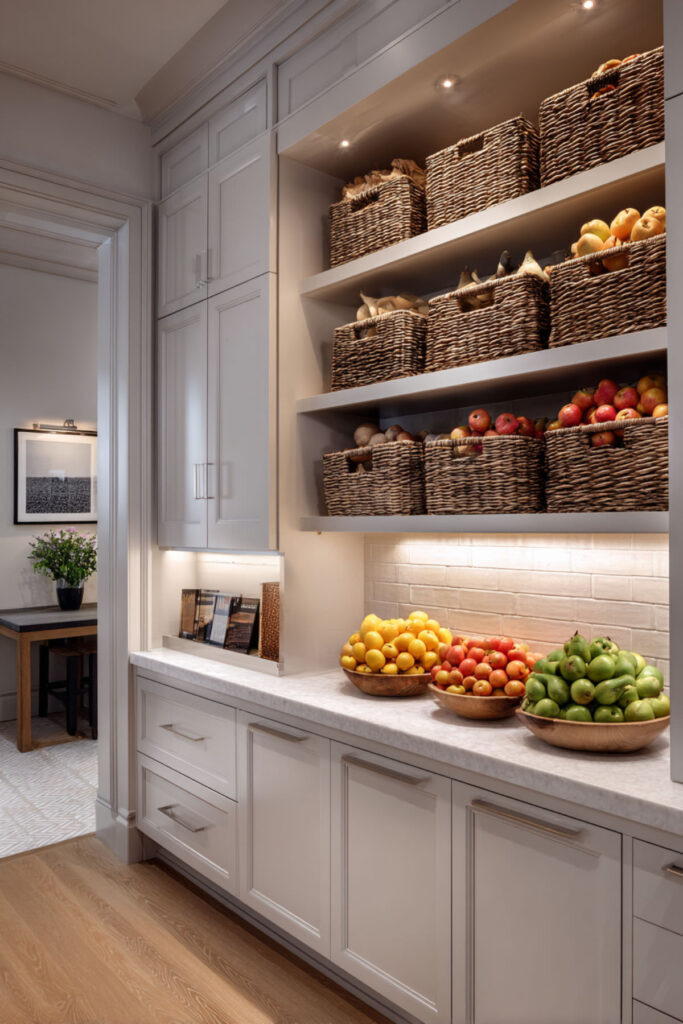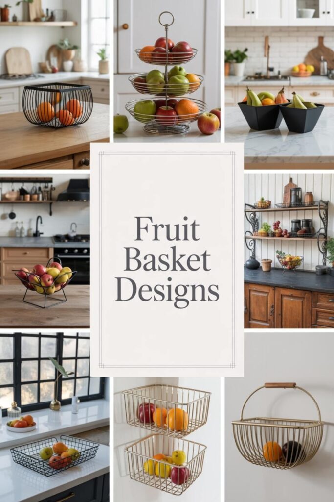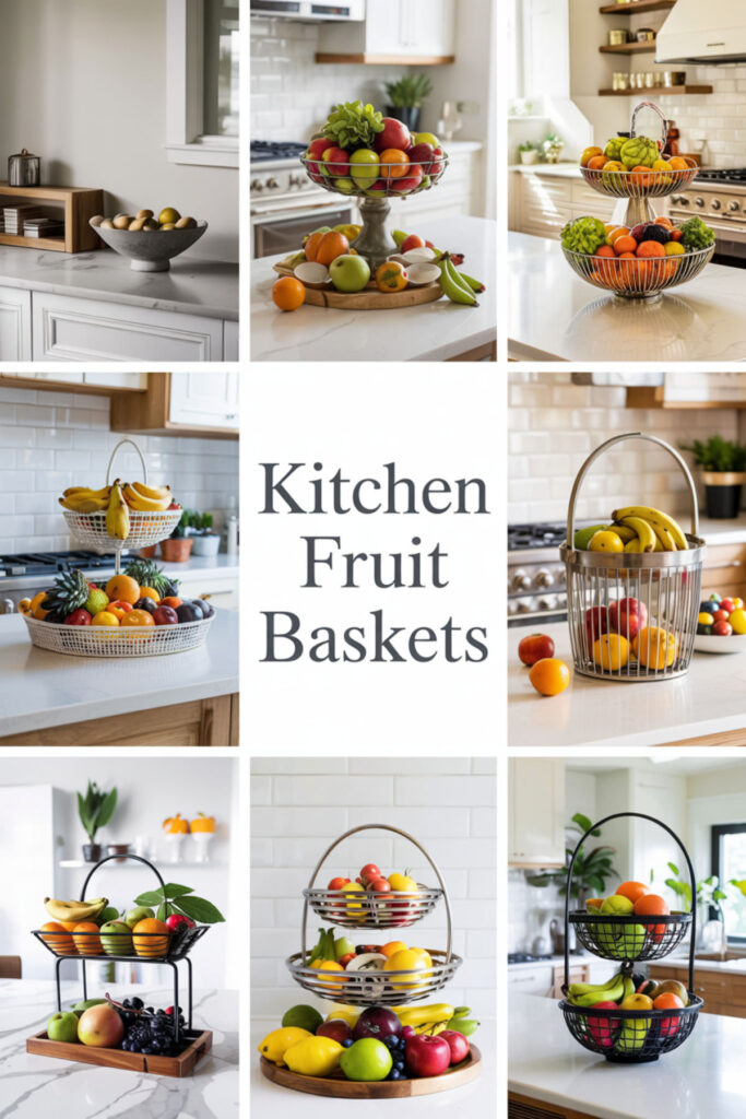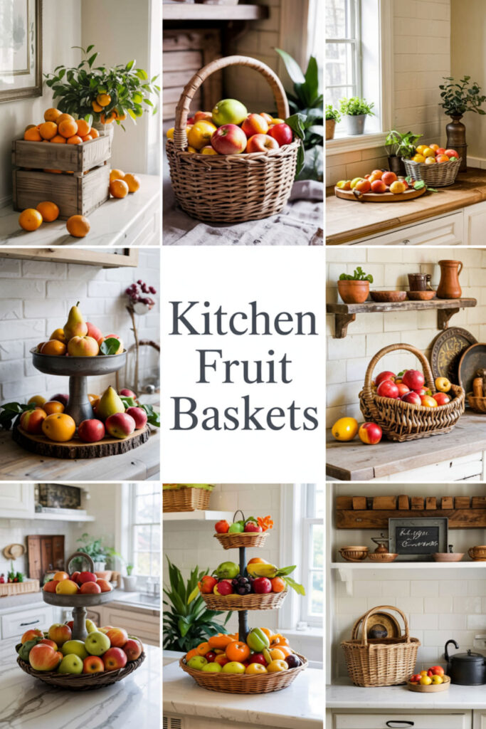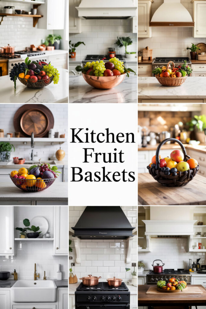 Embrace organized abundance with multiple fruit storage solutions creating a collected, market-style display. Mix baskets, bowls, and stands at different heights for that perfectly imperfect look. This style says “I cook, I eat well, I live fully.”
