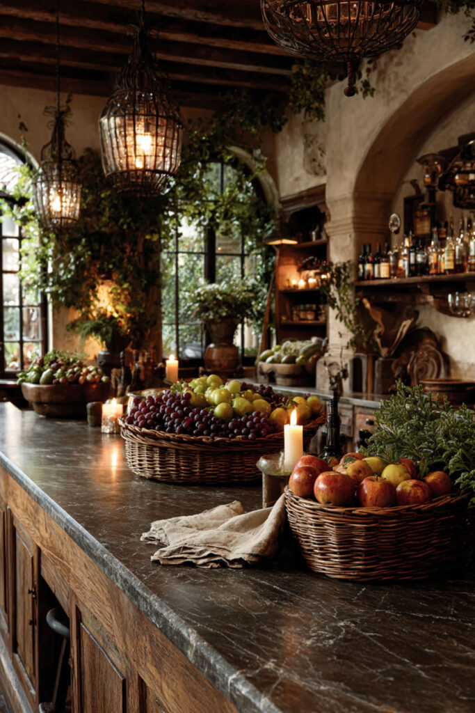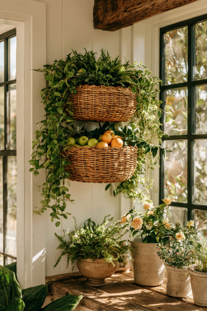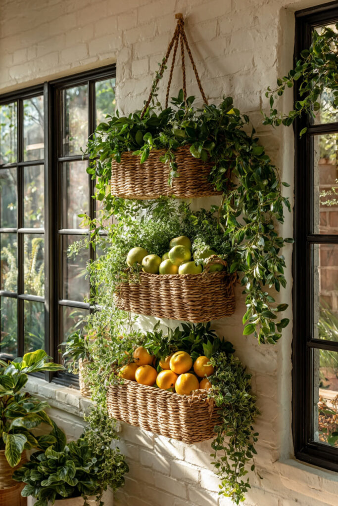 Create a living wall of produce with a series of hanging baskets that turn fruit storage into vertical garden art. This approach brings that European market feeling home, where abundance and beauty go hand-in-hand. Vary basket sizes and heights for visual interest.