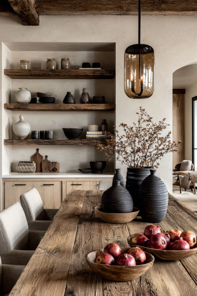 I really recommend this long wooden dough bowl that creates a table-runner effect with fruit. This placement encourages healthy snacking—fruit at eye level gets eaten, fruit hidden away gets forgotten. Change your display seasonally: citrus in winter, stone fruits in summer, apples in fall. It’s functional decor that actually serves a purpose.
