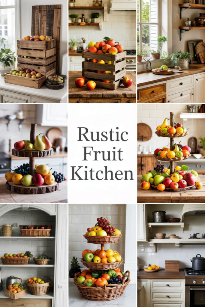 Channel farmhouse vibes with rustic wooden crates or vintage orchard boxes repurposed as fruit storage. Stack them, hang them, or line them up on open shelving for that market-stand feeling. The worn wood and visible grain add character that new storage never could.
