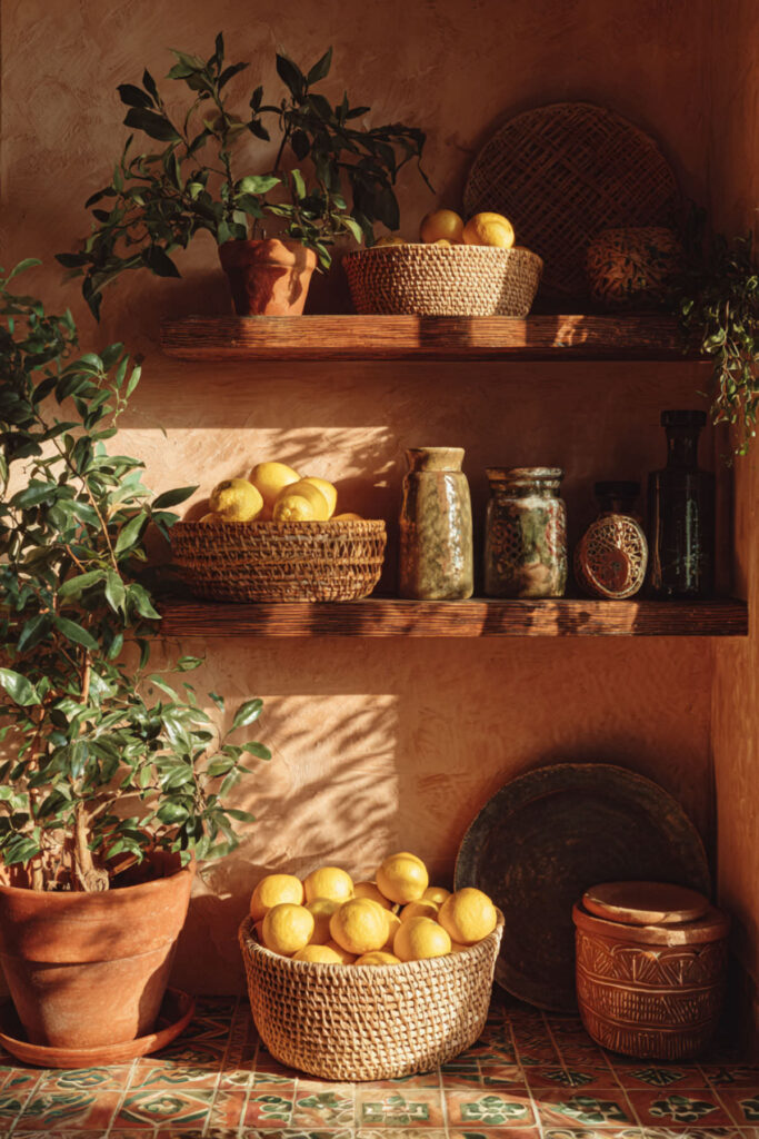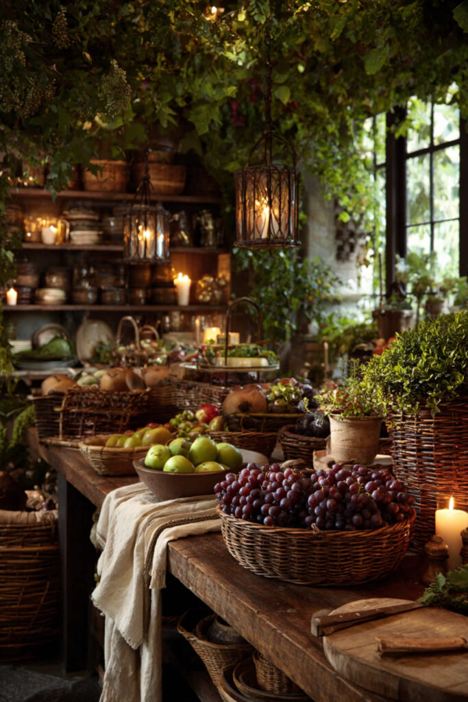 I really recommend this set of nested wooden crates that work individually or stacked. Fill them with fruit still on branches when possible—lemons with leaves, grape clusters—for that just-picked authenticity. This style says “abundant harvest” even if you bought everything at Trader Joe’s this morning.