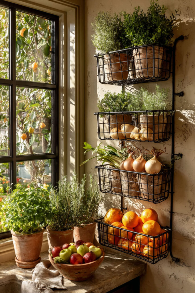 I really recommend these black wire wall baskets that look industrial-chic while being incredibly practical. You can see everything at a glance, grab what you need easily, and the visual impact is stunning—like having a produce section built into your wall. Label them subtly or let the contents speak for themselves.