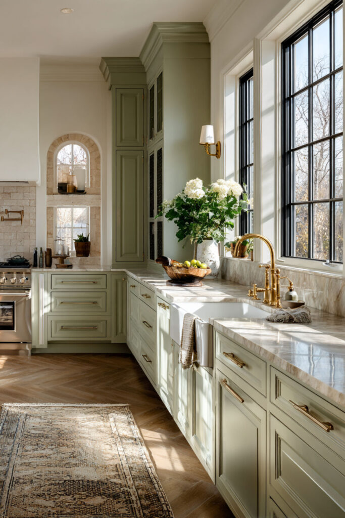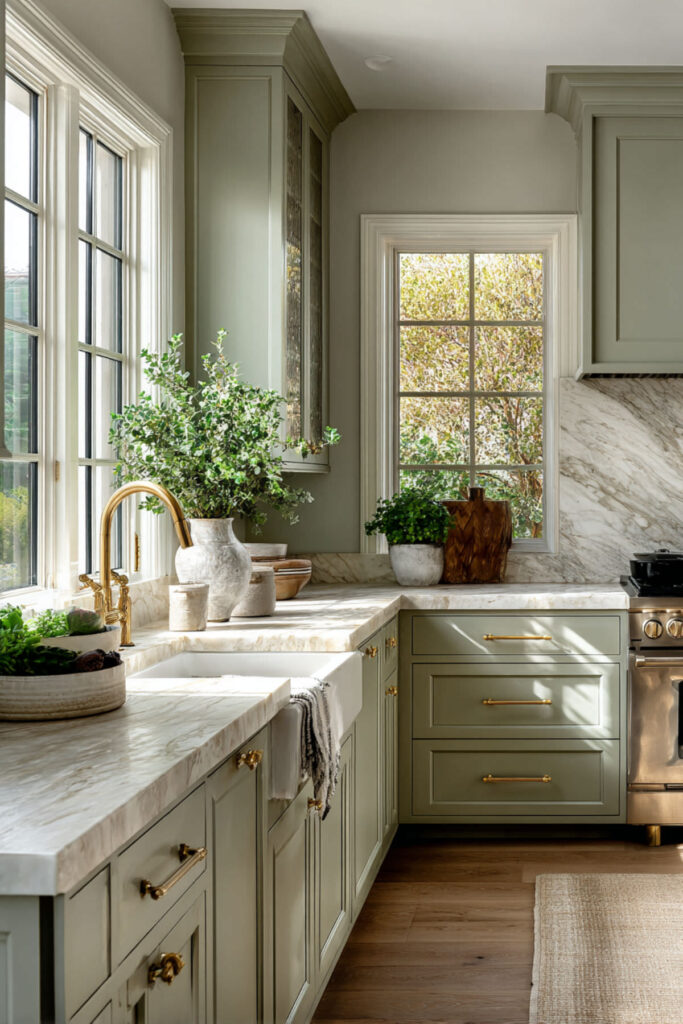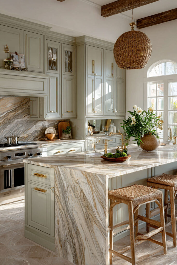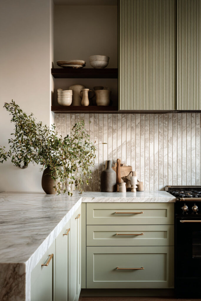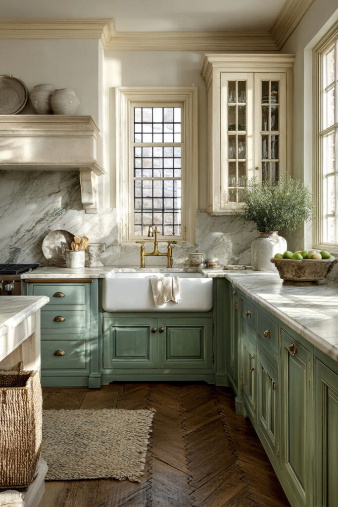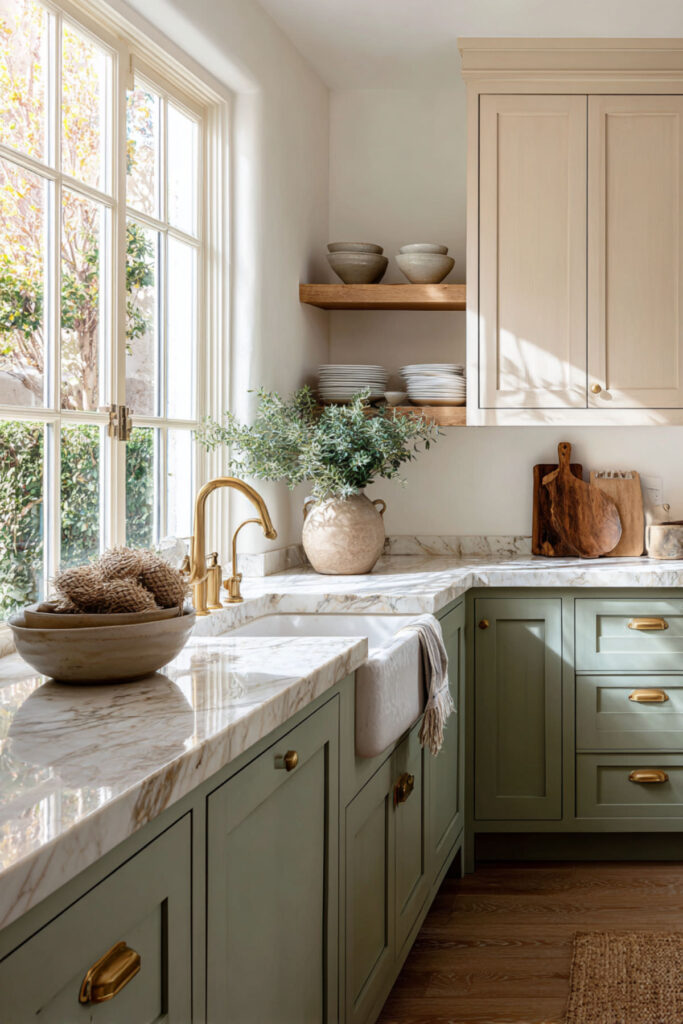 Marble has this quiet way of making everything around it look more refined, and against cream and green kitchen cabinets, the effect is really stunning. A white marble countertop with soft gray or gold veining bridges the two cabinet colors beautifully — the cool gray connects to the green, the warm gold connects to the cream, and suddenly the whole palette feels like it was designed by a single hand. I highly recommend a honed Carrara marble with warm undertones — the matte finish feels softer and more lived-in than polished, which suits this palette perfectly. It’s the kind of surface that makes a morning cup of tea look like a small ceremony. Some people worry marble is too high-maintenance for a kitchen, but I think at this stage of life, choosing something beautiful just because it’s beautiful is exactly the right move.