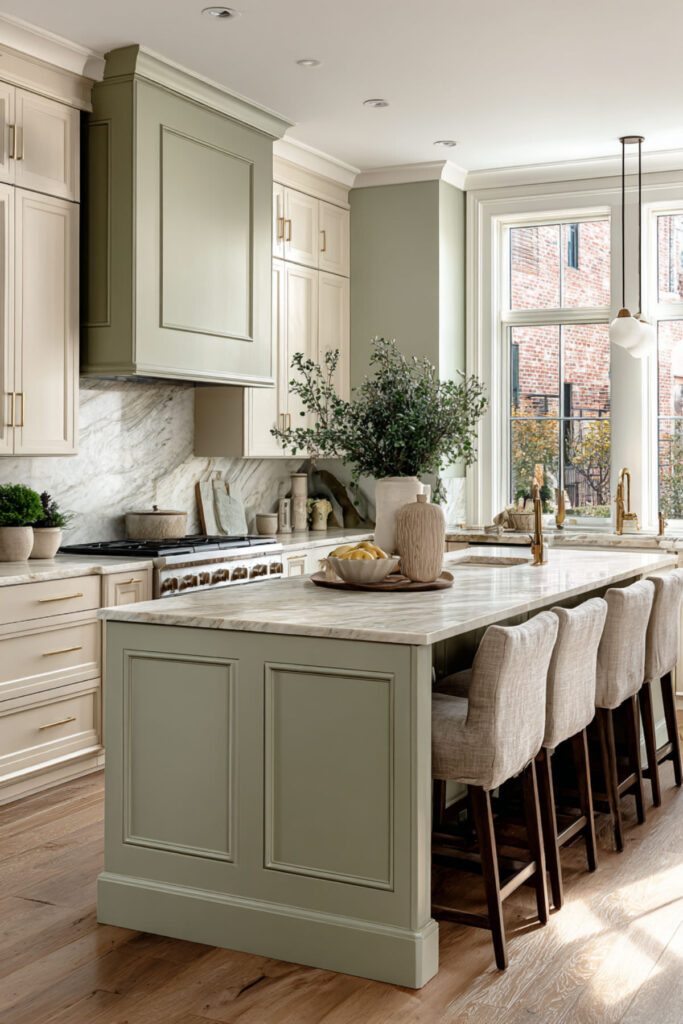 Cream and Green Kitchen Cabinets with Marble Countertops