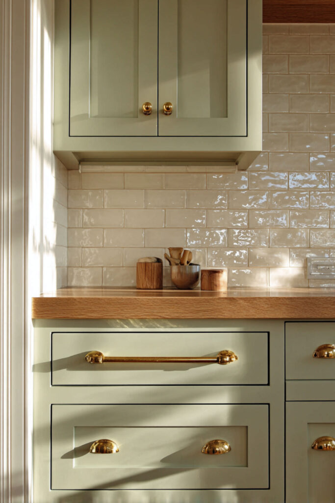 Sometimes the simplest combinations are the ones that last the longest. Soft sage green cabinets paired with a cream or off-white subway tile backsplash is one of those pairings that looks good immediately and only gets better with time. The tile adds texture without competing with the cabinet color, and the warm cream tones keep the green from feeling cold. I recommend a handmade or slightly irregular subway tile in a warm cream — the subtle variation in each tile adds character and makes the wall feel like it has depth and history. This combination works in every kitchen size and style, from a cozy galley to a spacious open-plan. It’s proof that you don’t need a complicated design to create something genuinely beautiful. Pair with brass hardware and a warm wood floor and the whole thing sings.