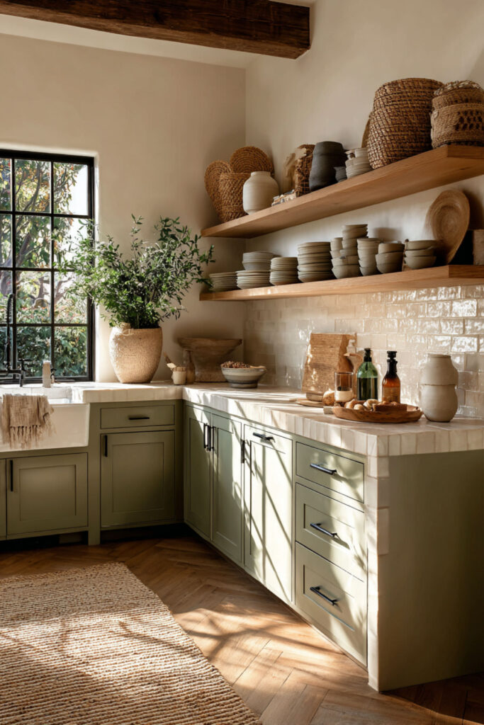 Cream and Sage Green Kitchen with Open Wooden Shelving