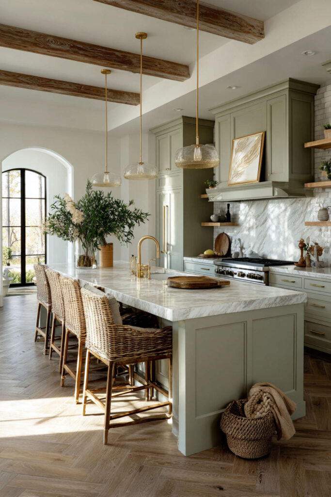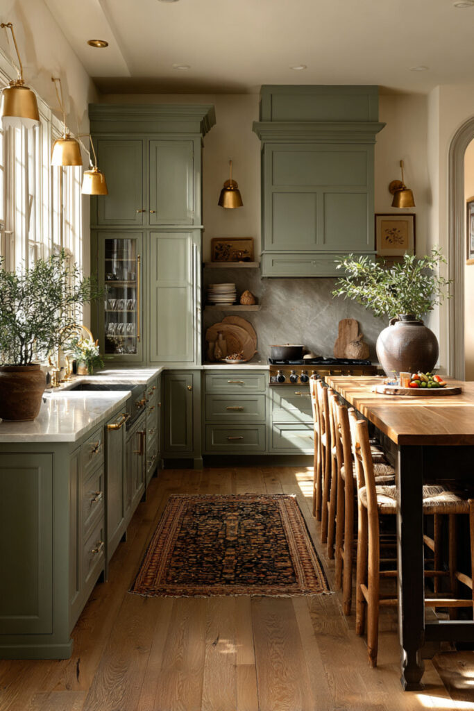 If you love the idea of green but want to ease into it, consider painting your island sage green while keeping the rest of your cabinets in cream. A green kitchen with cream cabinets and a contrasting island creates a gorgeous focal point that draws the eye without overwhelming the room. The island becomes the anchor — the piece of furniture that gives the kitchen personality. I recommend a sage green island with a warm butcher block or cream quartz top, paired with two or three low-back counter stools in natural linen. This setup is especially beautiful in kitchens that open to a living or dining area, because the green island reads like a deliberate design choice that connects the rooms. It’s the kind of kitchen where you’d happily sit with a glass of wine and a cookbook and not feel rushed to be anywhere else.