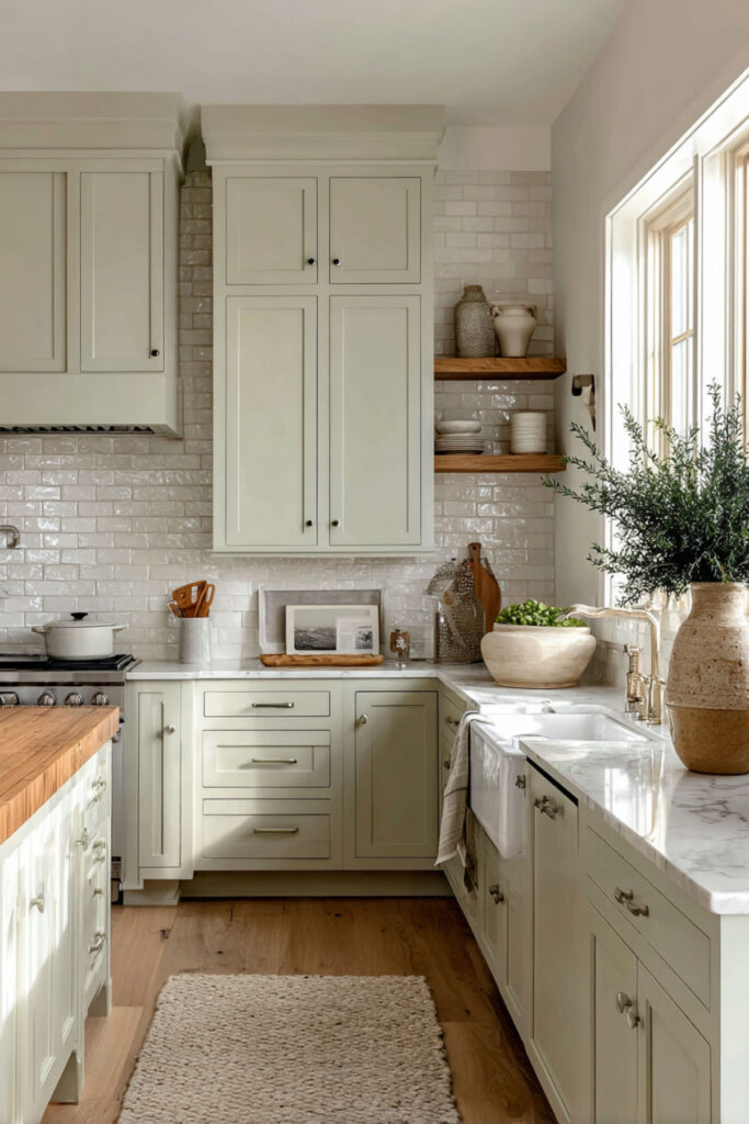 Soft Sage Green Cabinets with Cream Subway Tile