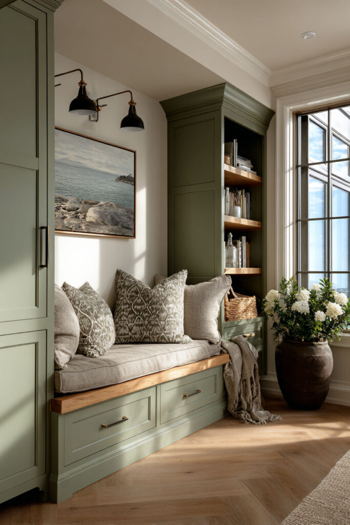 Here’s an idea that goes beyond the typical kitchen layout — and I think it’s especially meaningful for women in this season of life. If you have a corner or a window seat area in or near your kitchen, turn it into a quiet reading nook. A cushioned bench with sage green or cream upholstery, a small shelf for books, and a side table for your coffee cup. The kitchen becomes more than just a place to cook — it becomes a place to sit, think, and enjoy the quiet. I recommend a window seat cushion in a sage green linen with cream throw pillows — it ties into the kitchen palette and creates a dedicated spot that’s just for you. This is the kind of detail that doesn’t show up on most kitchen renovation lists, but for someone reclaiming their space? It might be the most important one.