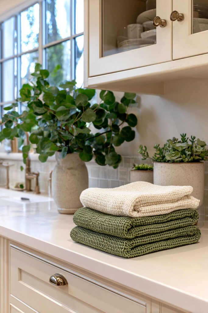 Not ready for a full renovation? That’s completely okay. You can bring the green and cream energy into your kitchen with a few thoughtful swaps. Start with linen dish towels in sage, a cream ceramic utensil crock, and a green stoneware bowl on the counter. I recommend a set of sage green linen napkins and a handmade ceramic vase in warm cream — they’re small pieces that shift the mood of a room without touching a single cabinet. A green enamelware colander, a cream stoneware butter dish, or a sage-toned candle in a pretty holder are all easy additions. These kinds of pieces let you test the color combination before committing to bigger changes. And sometimes, a few beautiful objects placed with intention are all you need to make a kitchen feel like yours again.