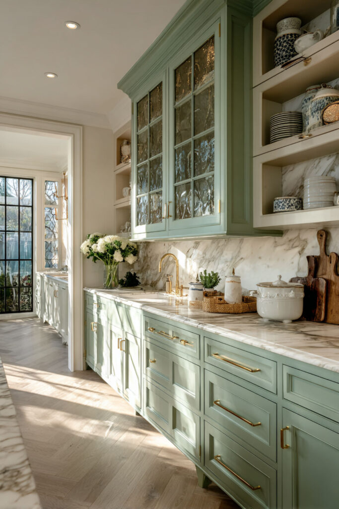 Sage Green and Cream Kitchen with Glass-Front Uppers