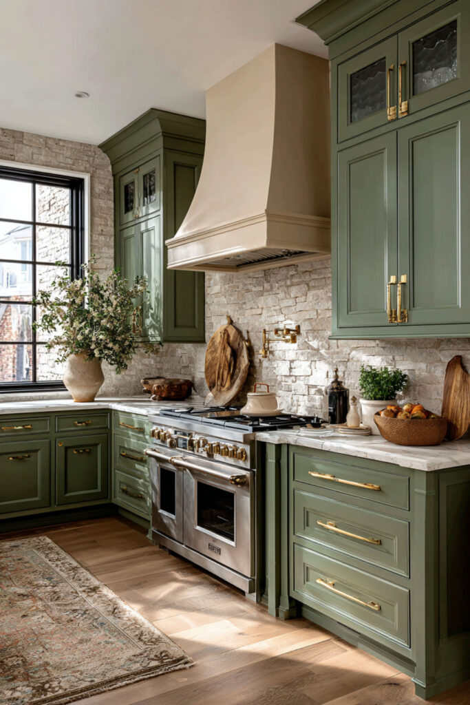 A cream-colored range hood mounted above green cabinets creates a beautiful focal point that draws the eye upward and gives the kitchen a sense of architecture. Whether it’s a curved plaster hood, a simple shaker-paneled wood surround, or a sleek modern shape, finishing it in cream while the surrounding cabinets stay green creates contrast that feels deliberate and elegant. I recommend a custom or semi-custom range hood surround in the same cream as your upper cabinets — it connects the top of the kitchen visually and frames your cooking area like a piece of built-in furniture. This detail has been showing up in those stunning kitchen renovations featured in homes across the Carolina lowcountry, and it translates beautifully into any space. It’s the kind of detail that makes a kitchen feel finished and truly yours.
