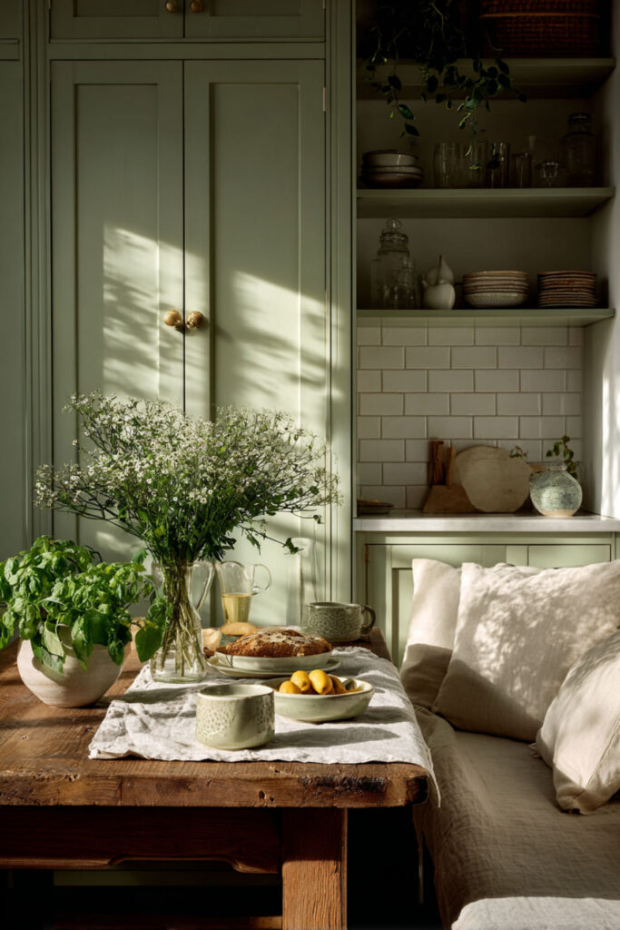 One thing I’ve noticed about the best green and cream kitchens is that they almost always include linen. Linen curtains, linen seat cushions, linen napkins on the table — the softness of the fabric against the cool green and warm cream creates an incredibly inviting, touchable quality. It makes the kitchen feel lived-in rather than staged. I recommend linen cafe curtains in a natural oatmeal or cream for your kitchen windows — they filter light beautifully and add that effortless, slightly European texture. A linen table runner in a soft sage across a cream-colored table is another gorgeous detail. These textural layers are what keep a pale sage green kitchen from feeling flat. They turn a color palette into a feeling — and that feeling is calm, soft, and exactly where you want to be.
