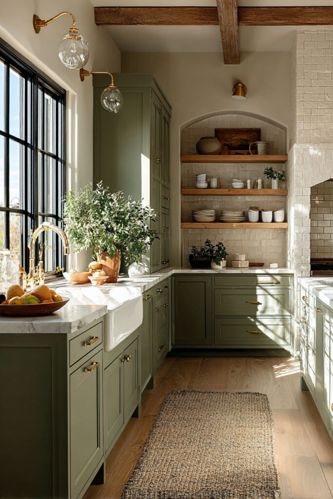 Lighting changes everything in a green and cream kitchen, and warm-toned fixtures make the whole palette come alive. Brass or gold-finished pendants over the island or dining table cast an amber glow that deepens the green cabinets and warms the cream walls, especially in the evening. I really recommend a pair of dome-shaped brass pendants — simple enough to look timeless, warm enough to make the room feel like it’s always golden hour. A muted green kitchen bathed in warm light feels like a space where you can breathe. And if you’ve spent the last twenty years putting everyone else first, having a kitchen that literally glows around you is a pretty wonderful thing. It’s not extravagant — it’s just right.