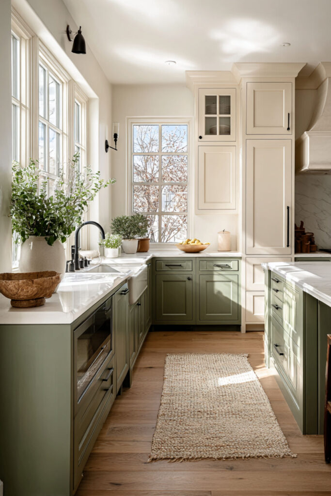 This is the two-tone arrangement that defines the green and cream kitchen — and it’s the most popular for a reason. Green on the bottom creates a grounded, earthy base. Cream on top keeps the upper half of the room light and open. The countertop between them creates a clean horizontal line that separates the two tones. It’s balanced, it’s beautiful, and it works in kitchens of every size and style.