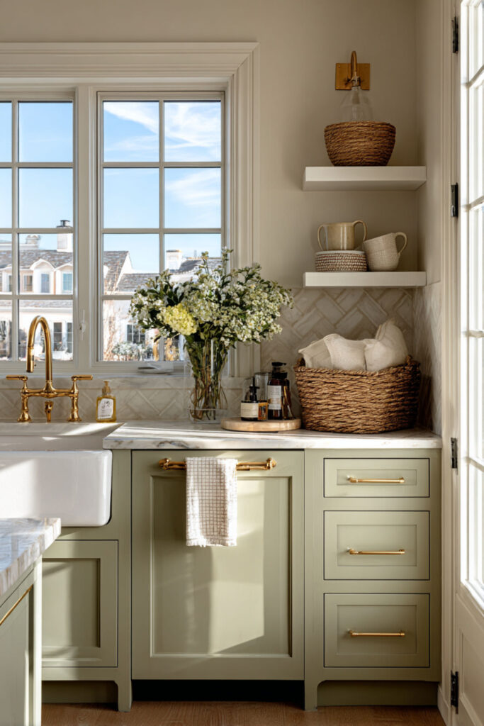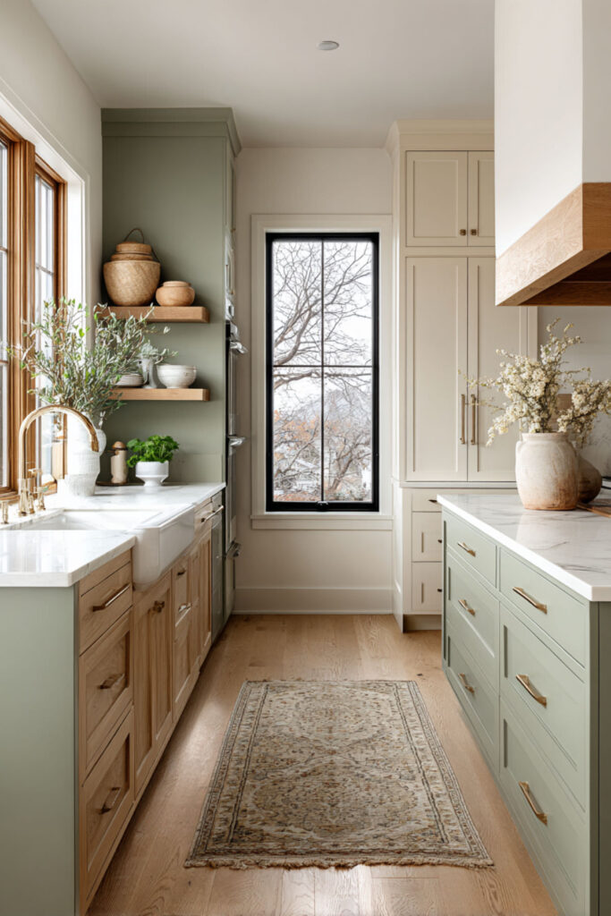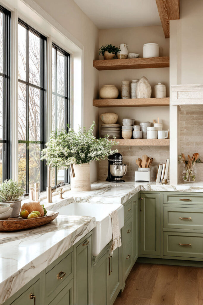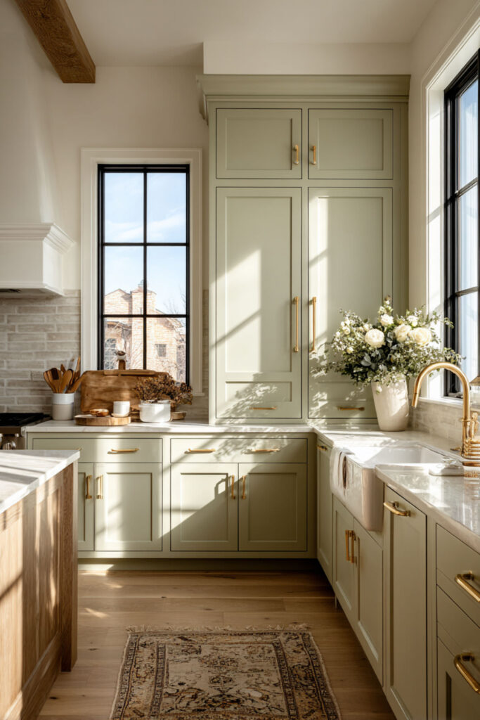 I recommend sage green and cream kitchen cabinets with unlacquered brass cup pulls, knobs, and a brass faucet. Over time, the brass develops a patina that makes the whole kitchen feel richer and more personal. A warm marble or cream quartz countertop keeps the surfaces bright. Sage green and cream kitchen cabinets with brass is a three-part combination that feels timeless from the moment it’s installed — the kind of kitchen that never needs updating because it was never chasing a trend to begin with.