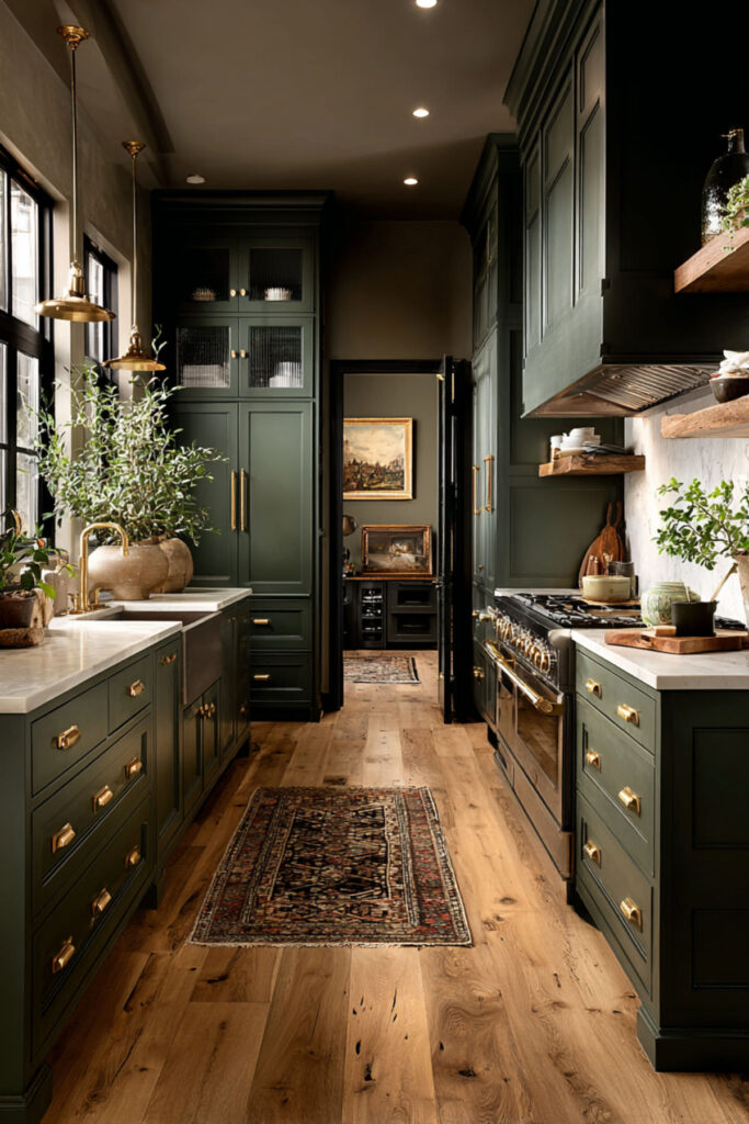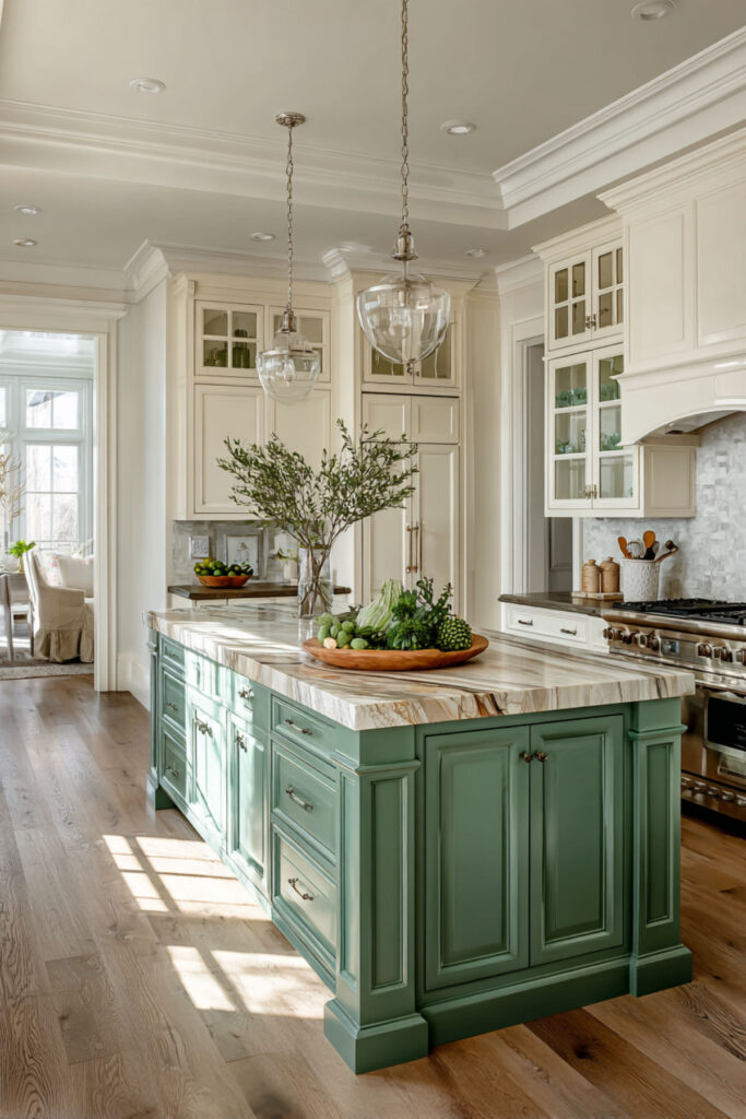 I recommend dark green and cream kitchen cabinets with the darker tone on the lower cabinets or island and cream on the uppers and walls. A warm marble countertop with green-gray veining bridges the two tones naturally. Brass hardware warms the dark green and keeps it feeling inviting rather than severe. It’s green and cream kitchen ideas with more contrast, more presence, and the kind of confidence that comes from choosing colors you’ll love for decades.