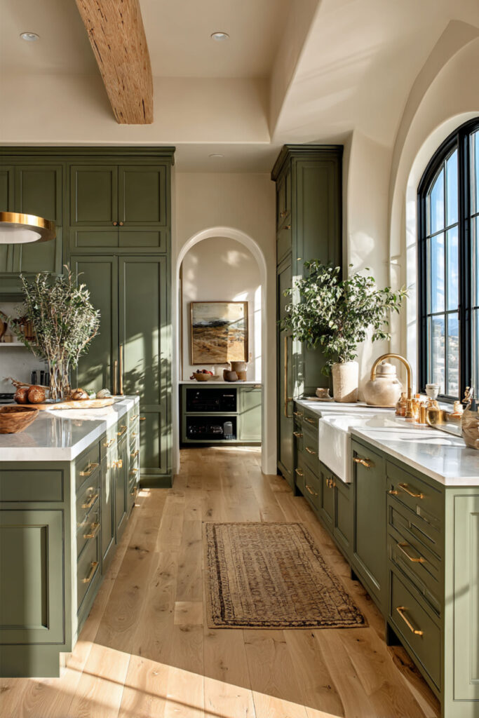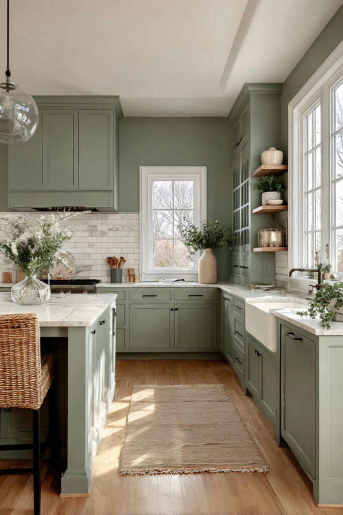 Full green cabinetry — uppers and lowers — set against cream walls and warm natural wood floors creates a kitchen that feels like being inside a garden. The green wraps around you at counter height, the cream walls open up the space above and around, and the warm wood flooring grounds everything with organic texture. It’s three materials that belong together because they all exist in nature: leaf, cloud, earth.