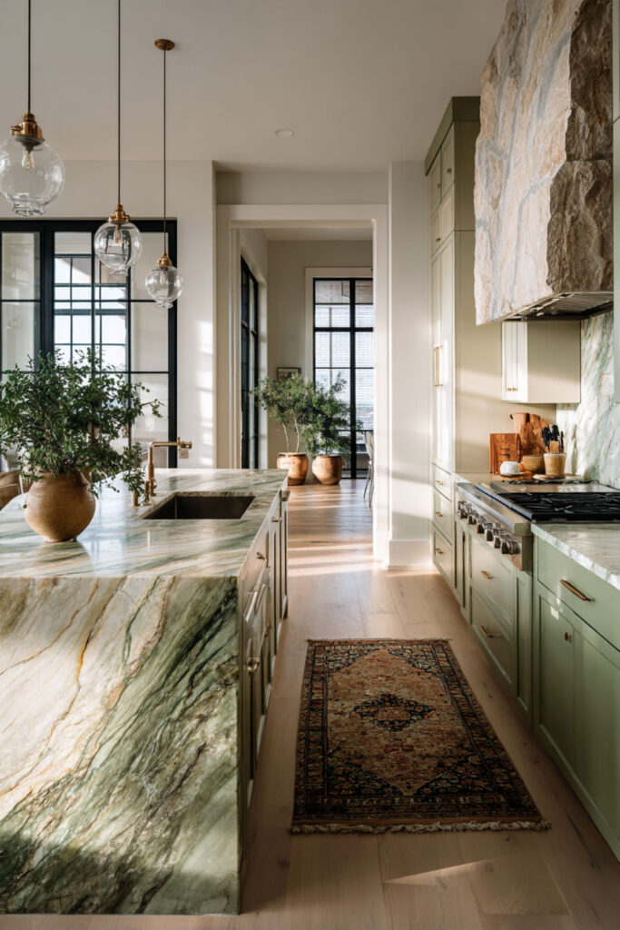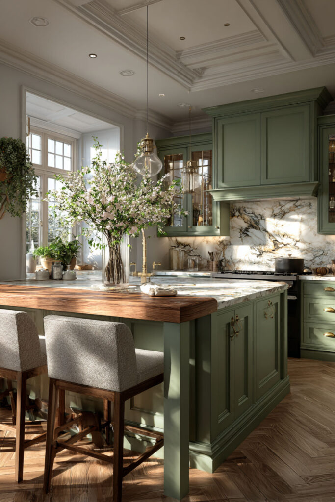 In a kitchen where the color palette is this balanced and this calm, one beautiful pendant light over the island or dining table is all the focal point you need. The pendant becomes the room’s crown — a single object that draws the eye up and completes the vertical composition from floor (wood), to counter (marble), to cabinet (green and cream), to ceiling (light). One fixture. One moment. And it’s enough.