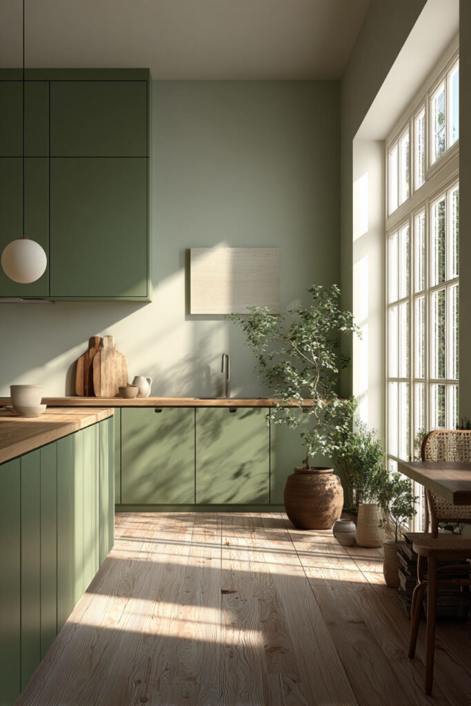 Green Kitchen With Cream Walls and Natural Wood Floors