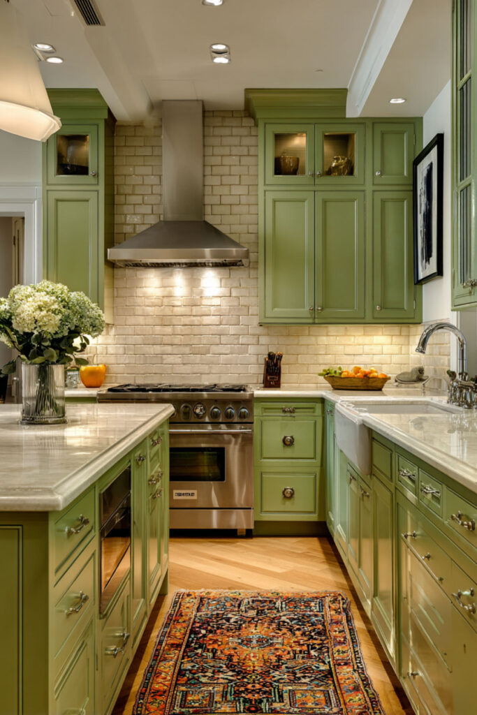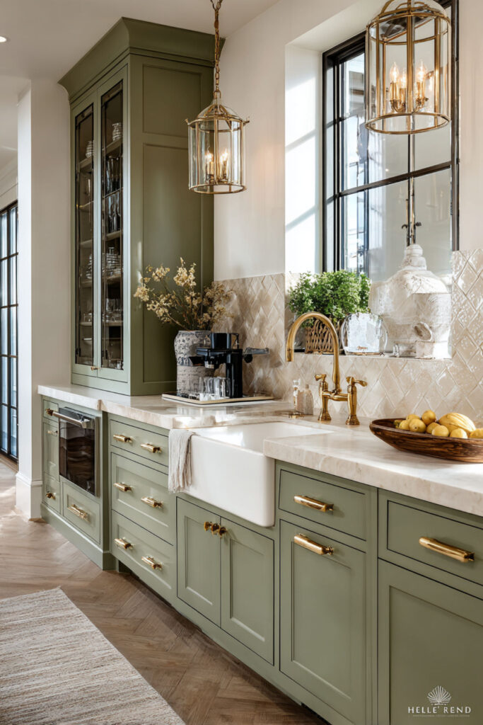 I recommend fern green kitchen cabinets with a cream handmade or zellige tile backsplash and a warm cream countertop. The backsplash tiles add texture that complements the bold green, and the cream grout keeps the tile surface warm. Brass hardware connects the two tones with a golden accent. Fern green kitchen is the most confident version of this palette — still balanced, still timeless, but with a freshness that makes the kitchen feel like the first warm day of spring.