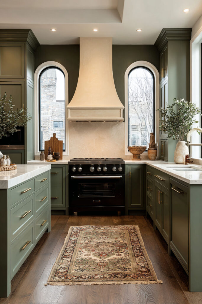 A cream-painted or cream-plastered range hood against green cabinetry creates a focal point on the stove wall that’s both functional and beautiful. The cream hood stands out against the green, drawing the eye to the cooking zone, while its warm tone keeps the contrast gentle rather than jarring. It’s a design detail that makes the stove wall feel architectural and considered.