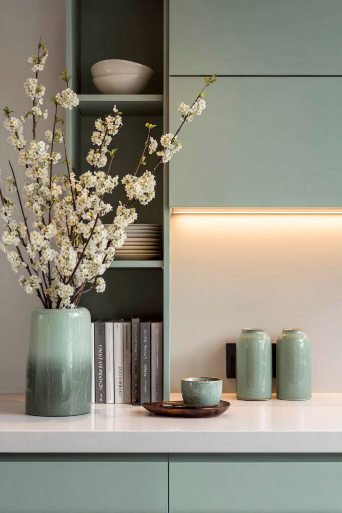 In a kitchen designed around timeless natural balance, the countertop should be as calm as the color palette. Minimal styling — two or three carefully chosen objects rather than a cluttered display — lets the green and cream surfaces do the talking. A single vase, a cutting board, and your morning coffee setup. The clear counter makes the colors more visible, the room more spacious, and the whole kitchen more peaceful.