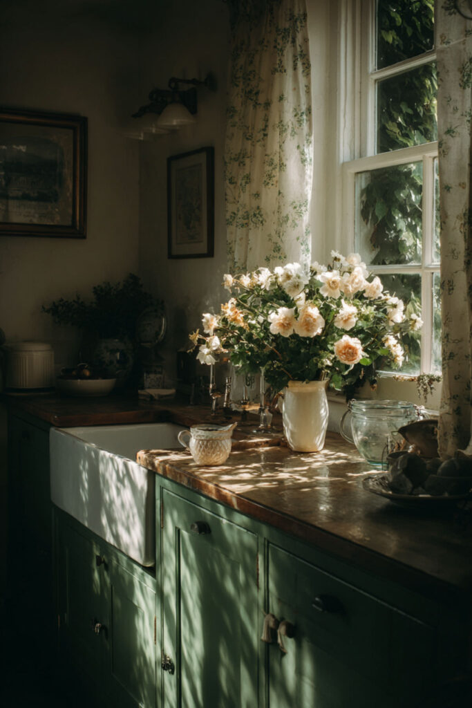 Celadon — a soft, slightly blue-toned green that originated in Chinese ceramics centuries ago — is one of the most serene greens you can put in a kitchen. Paired with cream and layered with linen textures (curtains, napkins, a table runner), a celadon kitchen feels like a room designed for calm. The slightly cool green, the warm cream, and the soft fabric create a sensory palette that’s gentle from every angle.
