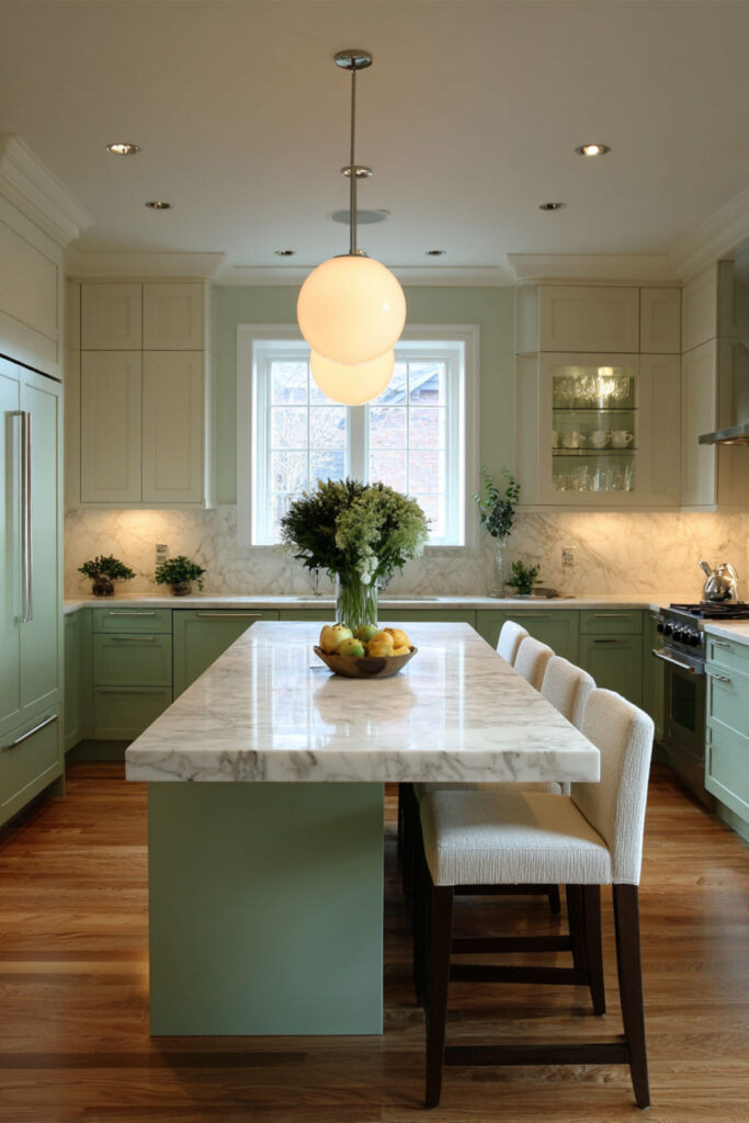 Marble is the material that bridges green and cream most beautifully, because natural marble often contains both tones in its veining — soft greens, warm creams, golden threads, gray undertones. A marble countertop between green lower cabinets and cream upper cabinets creates a continuous visual story from bottom to top, with the stone acting as the natural connector between the two colors.