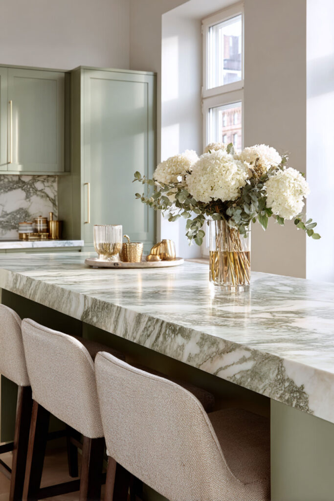 I recommend a Calacatta or warm-veined marble countertop (look for stone with golden and greenish undertones) with green lowers and cream uppers. The marble’s natural variation means no two installations look the same — your countertop will be individually beautiful. It’s a cream and green kitchen where the stone does the design work of blending the two tones, and every morning the light hits the veining differently. Natural balance, literally set in stone.