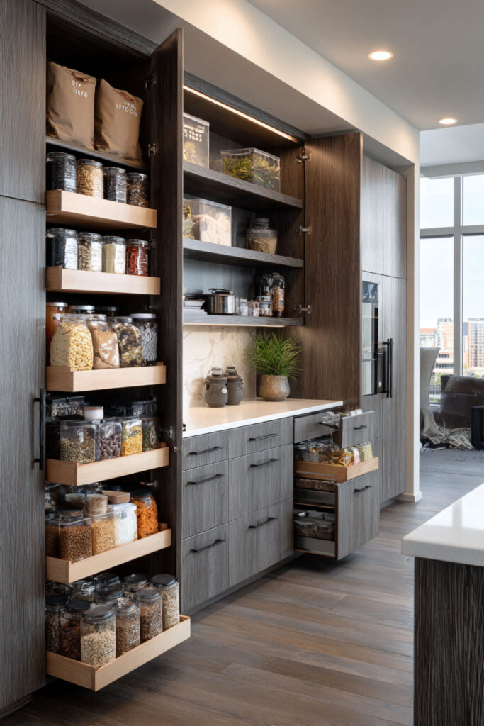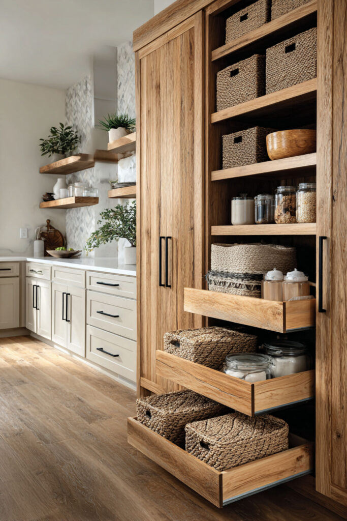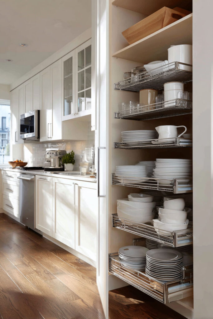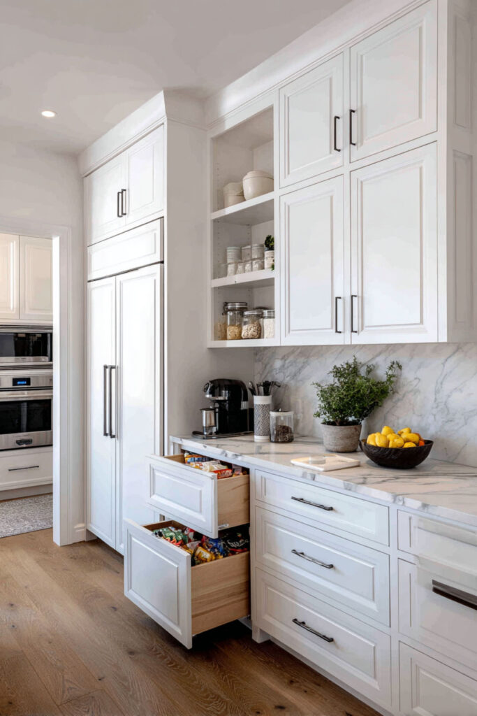 Pull out shelves or slide out shelves transform deep cabinets from black holes into functional storage. No more crawling inside to reach something while your toddler attempts base jumping from the counter. Full-extension slides mean everything’s visible and accessible. Lower pull-outs can hold snack bins toddlers can reach themselves.