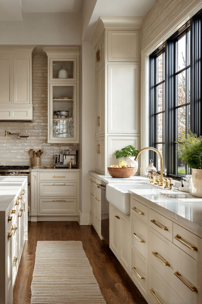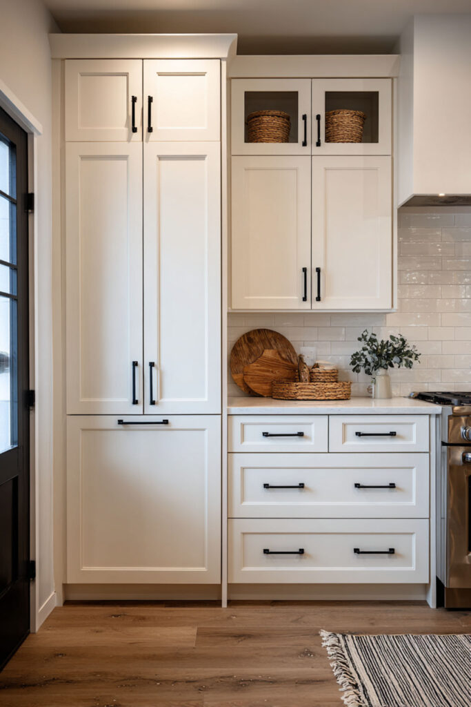 I recommend this farmhouse cabinet system with integrated baby locks; they look like decorative hardware but function as safety features. The style says “cozy family kitchen” while the function says “I have toddlers and I’m not sorry.”