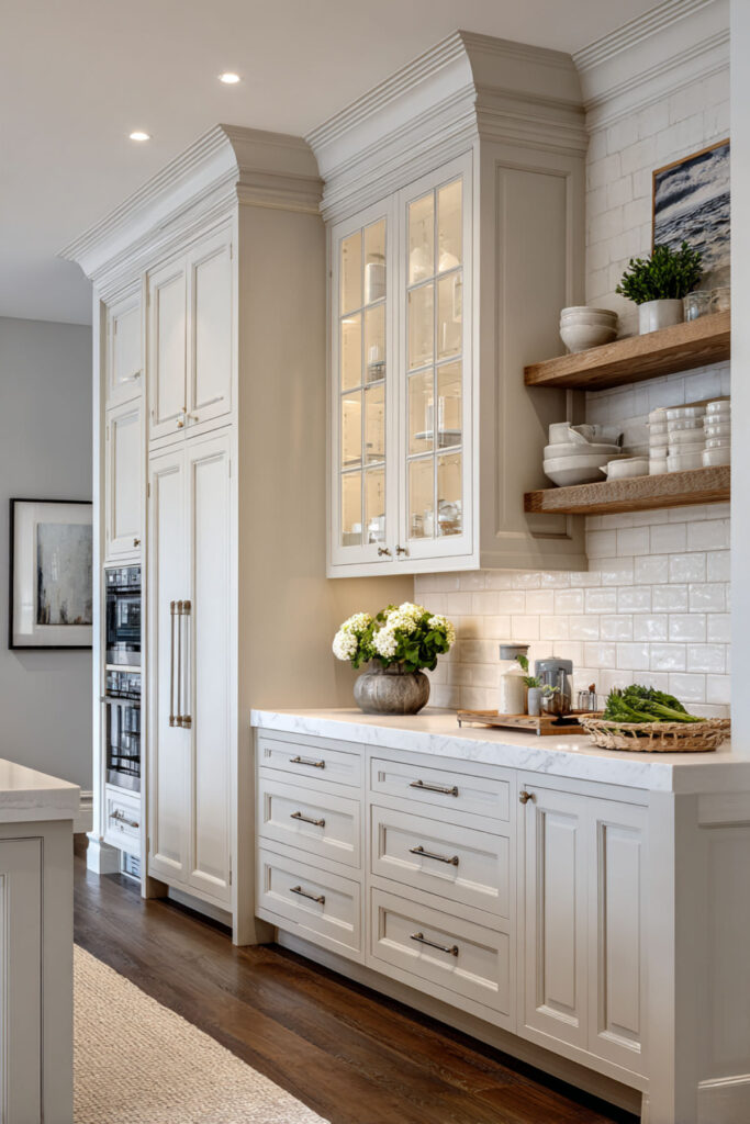 Farmhouse kitchen cabinets combine style with family practicality. Open shelving displays pretty dishes up high, closed storage below hides toddler chaos. Beadboard details are forgiving of dings and scratches. Built-in plate racks keep dishes secure but accessible.