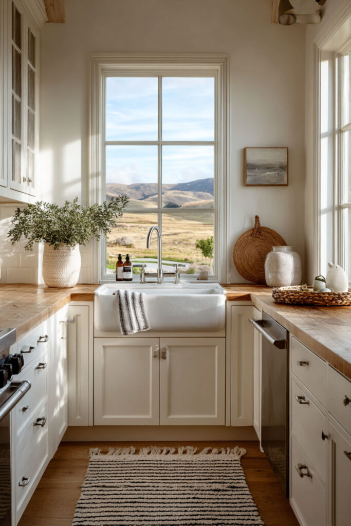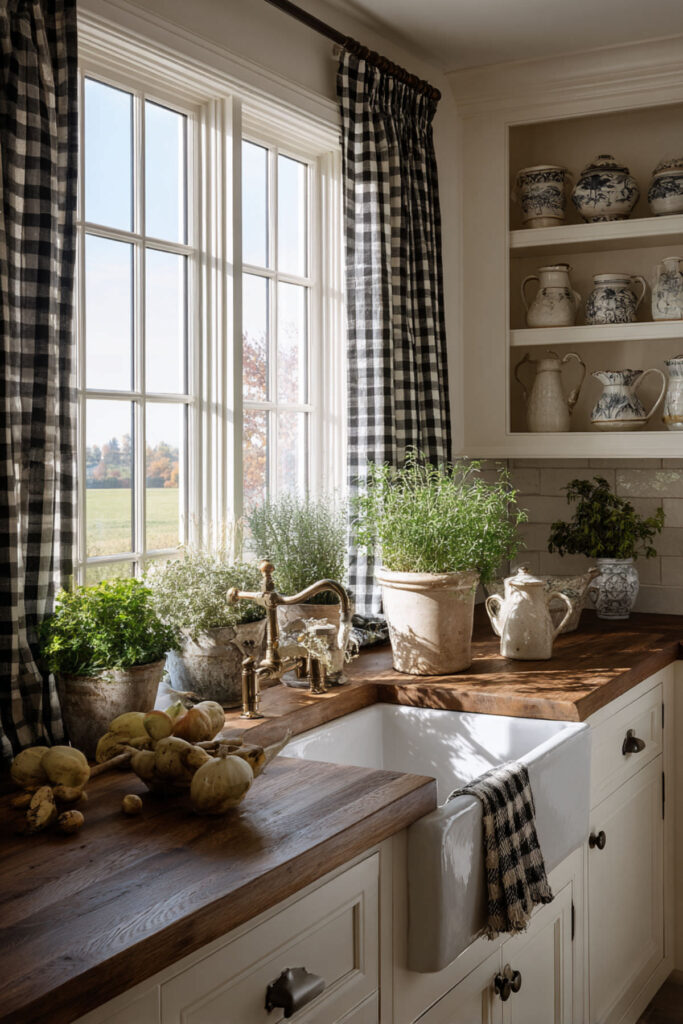 Just because your kitchen is tiny doesn’t mean it can’t pack a massive farmhouse punch. In fact, smaller spaces often feel cozier and more authentic—like those cottage kitchens you see in the English countryside. Use every inch wisely with ceiling-mounted pot racks (so farmhouse), magnetic knife strips, and hooks everywhere for maximum function.