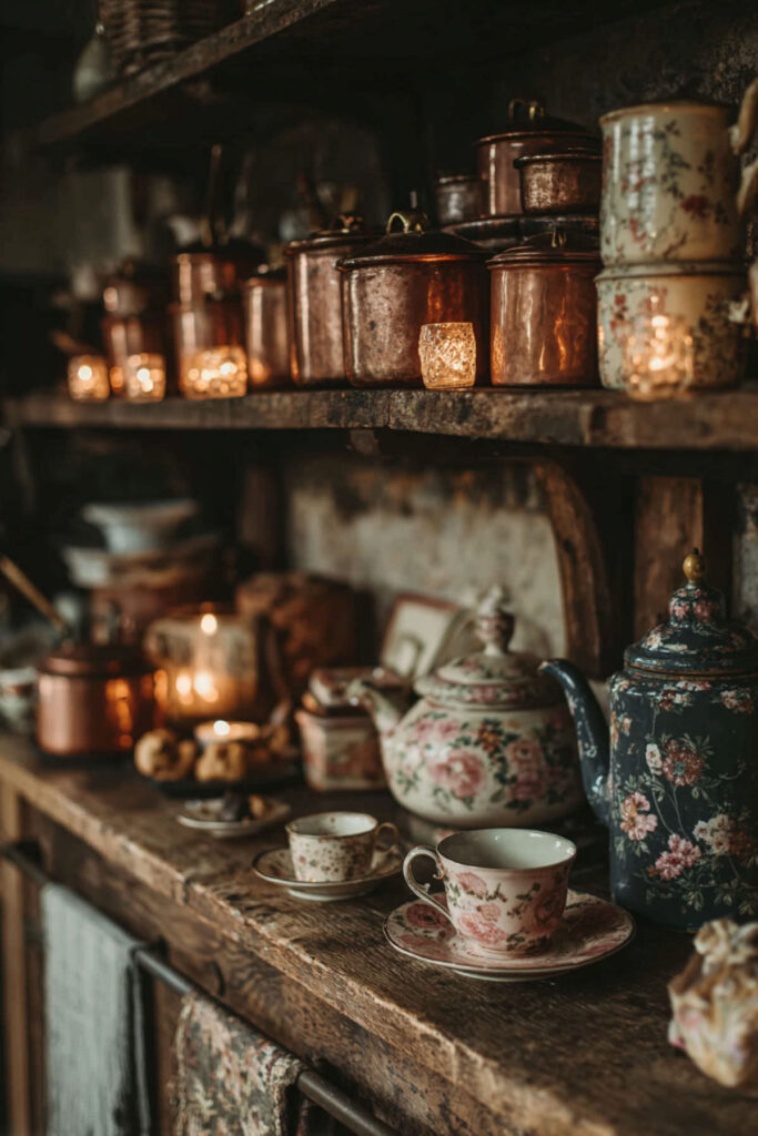 I really recommend these sturdy bracket-and-wood shelf combinations that can handle the weight of your heaviest dishes. Display your prettiest pieces (those thrifted ironstone plates, your grandmother’s mixing bowls) and suddenly they become part of the decor. Mix in some greenery, maybe a vintage scale or two, and you’ve created these little vignettes that make doing dishes feel less like a chore. Just keep your everyday items on the lower shelves for easy access.