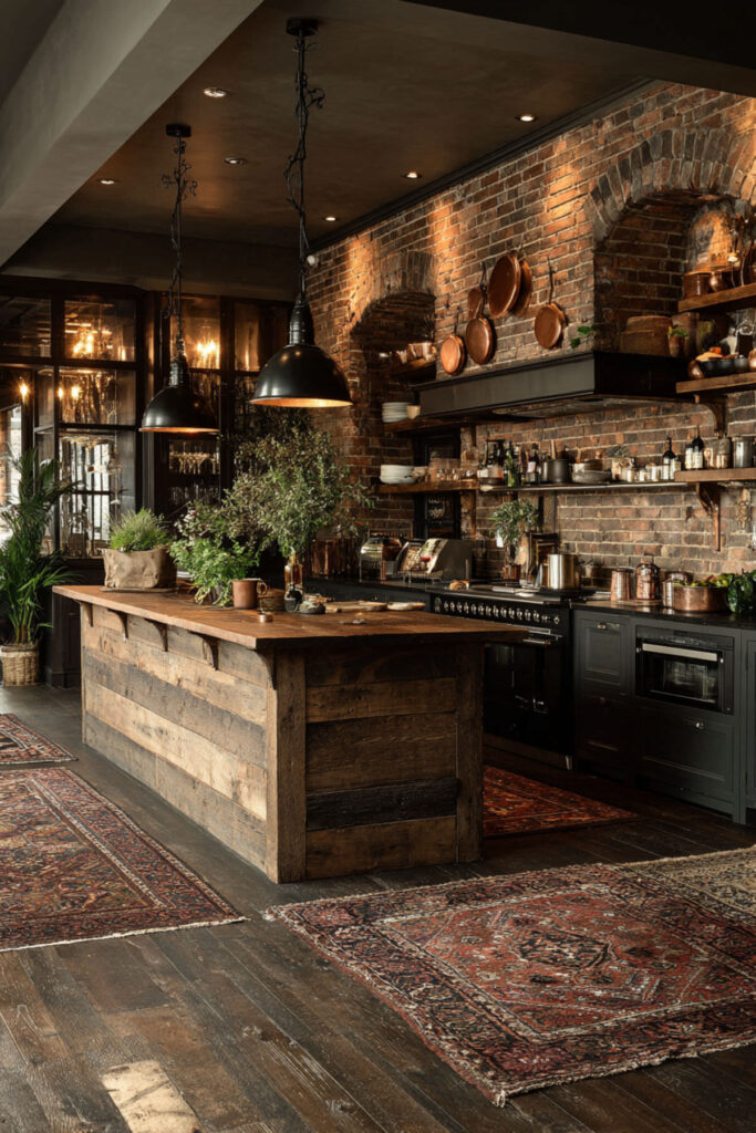 Mix exposed brick with reclaimed wood elements—maybe a floating shelf made from an old barn beam or a reclaimed wood range hood—and you’ve got layers of texture that make your kitchen feel like it’s been there forever. I really recommend this brick sealer if you’re working with real brick to prevent dust and make cleaning easier. The combination of rough brick and smooth wood creates this perfect rustic balance.