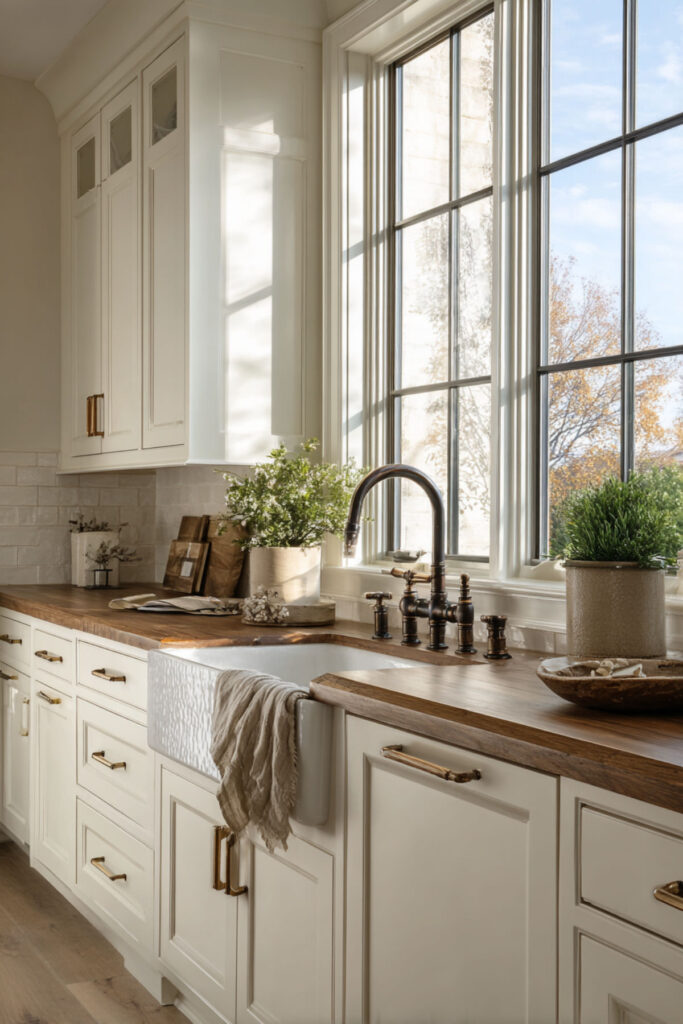 Nothing says “welcome home” quite like walking into a kitchen with gorgeous exposed wood beams stretching across the ceiling. They instantly add architectural interest and that authentic farmhouse vibe that feels both grand and cozy at the same time. If your home doesn’t have original beams (most don’t), you can totally fake it with hollow box beams that look incredibly real.