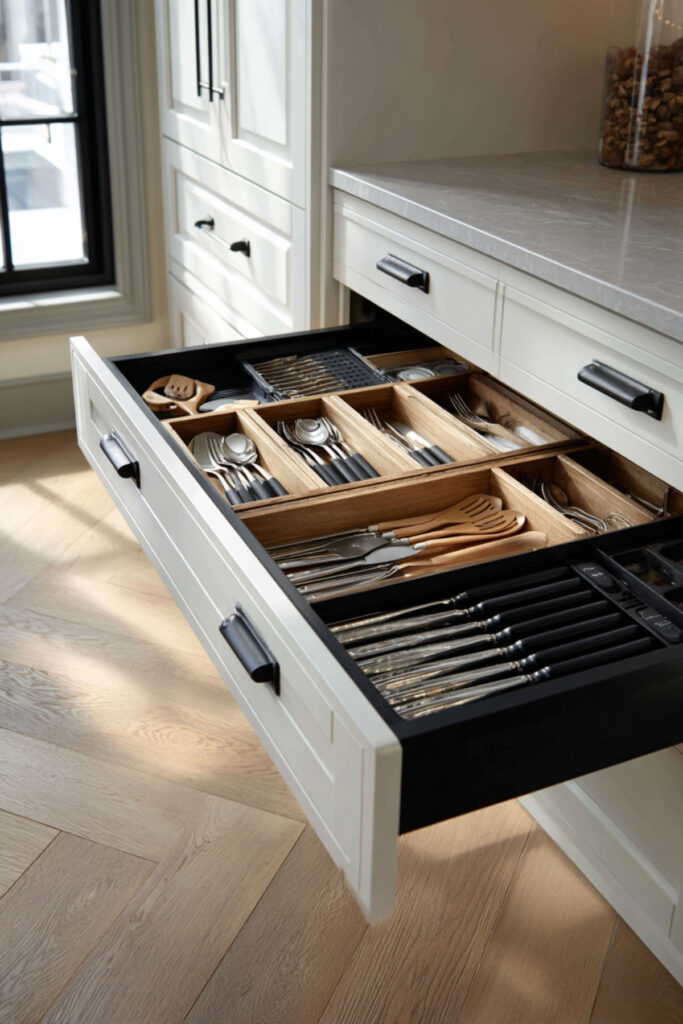 Modern kitchens thrive on hidden organization—everything has a place but nothing clutters surfaces. Think drawer inserts you can’t see when closed, pull-out organizers behind cabinet doors, integrated knife blocks in drawers.