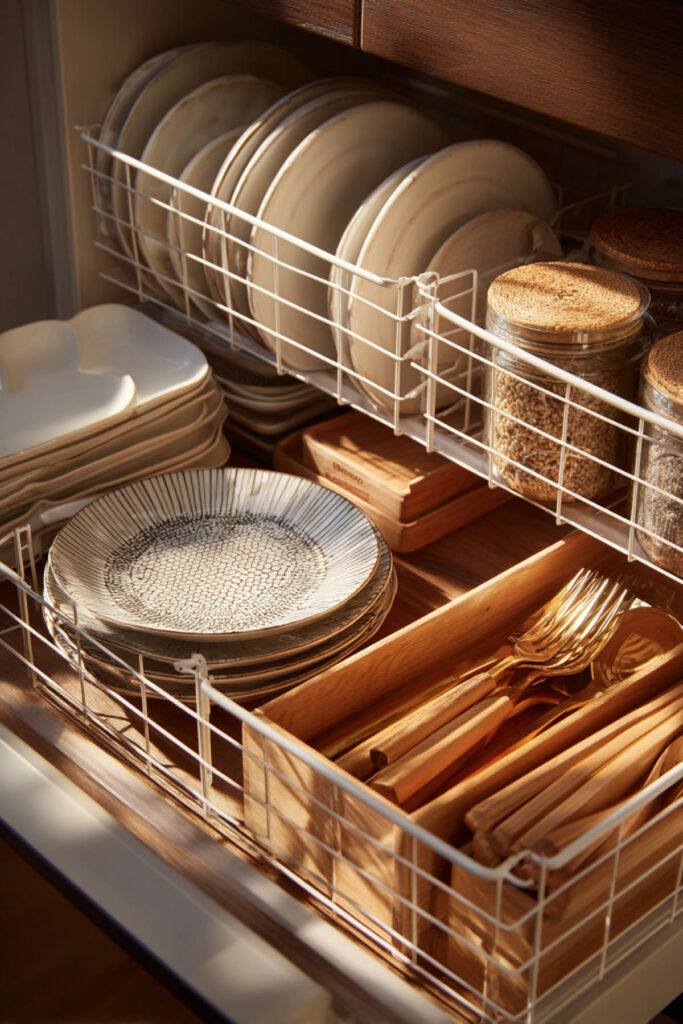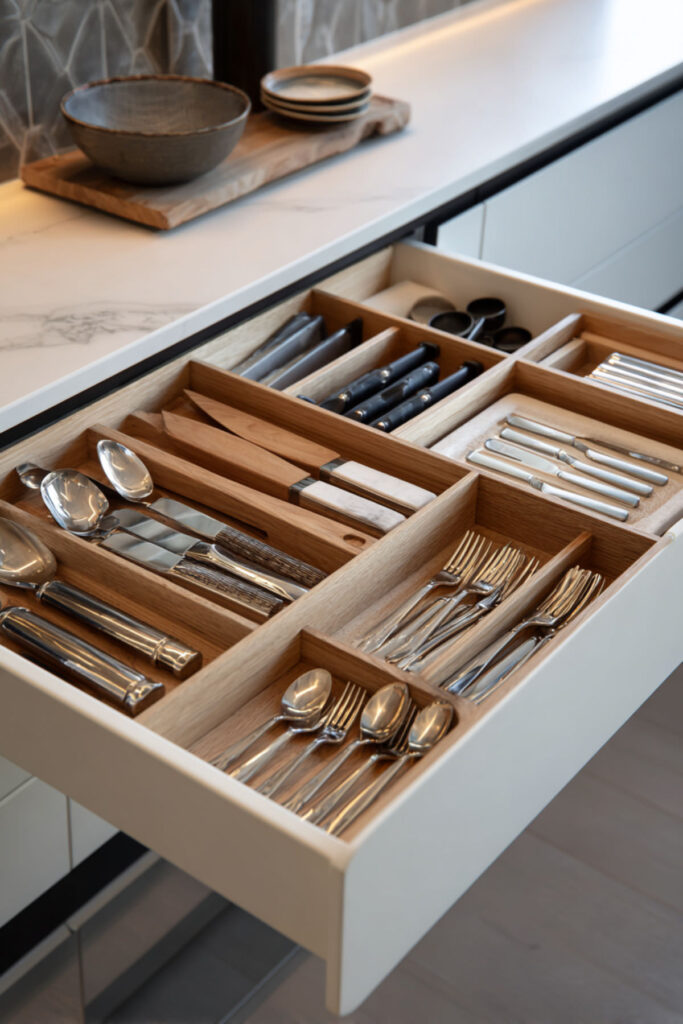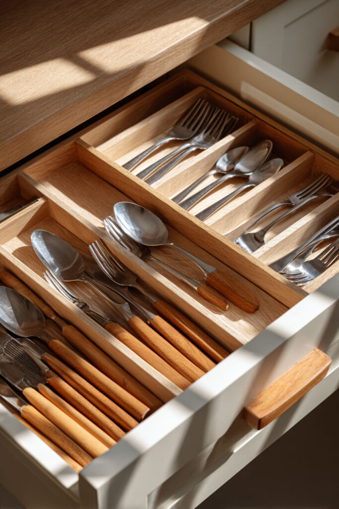 I really recommend this wooden tray divider for cabinets. The trick is assigning each section a specific purpose and sticking to it. Add drawer liner underneath to prevent sliding, and suddenly your cutlery drawer stays organized without constant maintenance.