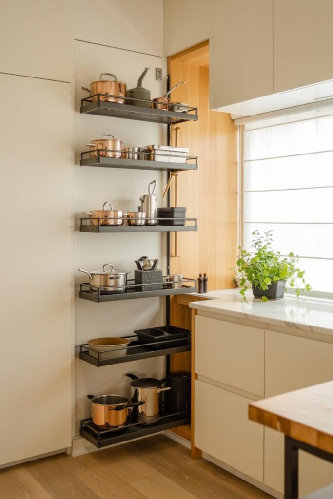 Converting a cabinet near your stove into a pull-out utensil station changes everything. Install pull-out drawers or a tall pull-out organizer with containers for different tool categories. Everything stays hidden but instantly accessible.