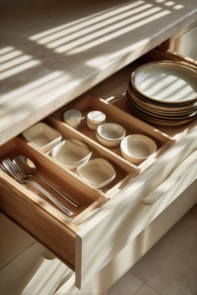 I really recommend this in-drawer knife block that keeps blades protected and fingers safe. The goal is maximum function with minimal visual noise. This approach makes kitchens feel larger and calmer, even when fully stocked.