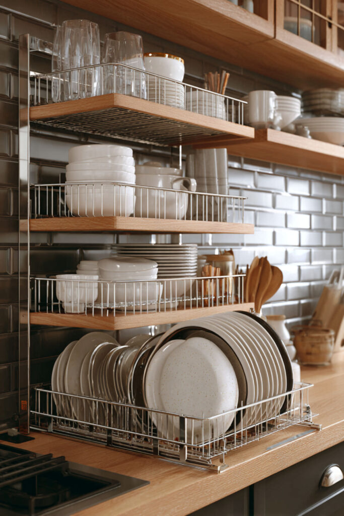 I really recommend this sturdy stainless steel rail with S-hooks that holds everything from ladles to cutting boards. Position it between your stove and prep area for maximum convenience. The visual impact is surprisingly stylish—your tools become part of the decor while staying completely functional.