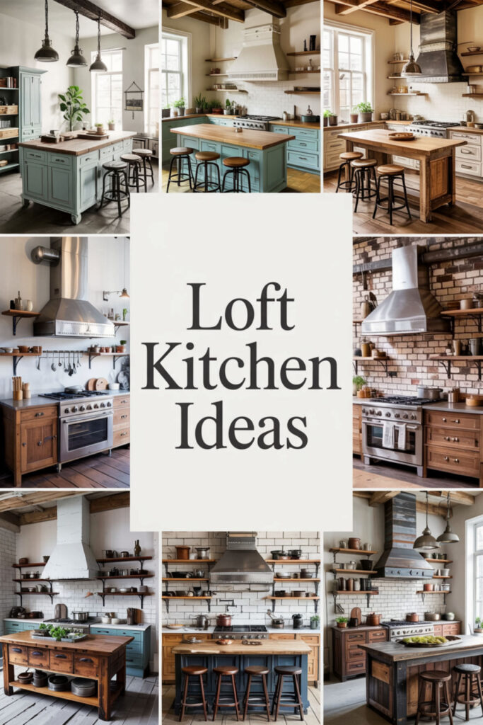 Your kitchen island becomes the star in open loft layouts—it defines the kitchen zone while providing crucial storage and prep space. Choose something substantial: reclaimed wood top on iron legs, a vintage industrial cart, or even a repurposed workbench.