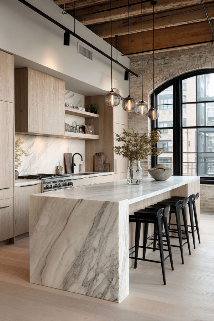 I really recommend these thin brick veneers that add authentic texture without structural concerns. This bold choice works best in larger lofts where the island has room to breathe. It becomes the unmovable heart of your kitchen.